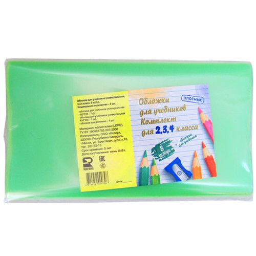 Обложки для учебников универсальные, 2,3,4 класс, 9шт/уп. Номинальное количество – 9 шт. - обложка для учебников универсальная 465*230 – 7 шт., - обложка для учебников универсальная 410*230 – 1 шт., - обложка для дневника – 1 шт. Материал: полиэтилен (LDPE) ТУ BY 190587785.003-2006 Изготовитель: ООО «Ротир» Срок хранения: 5 лет.