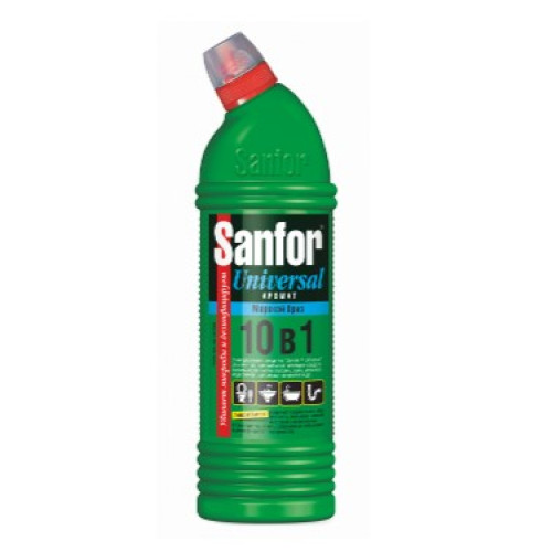 Гель Санфор 10 в 1 для разных поверхностей универсальный. Аромат: ассорти. С расширенным диапазоном действия. Легко и быстро отчистит раковины, ванны и душевые кабины, унитазы, сливы и водостоки, керамическую плитку, кухонные плиты, любые твердые моющиеся напольные покрытия, настенные панели, моющиеся обои, бытовую технику. Подходит для уборки и дезинфекции туалетов для животных. Эффективно устранит серый налет, плесень, жир, мыльные потеки, въевшиеся пятна от продуктов питания и другие загрязнения. Благодаря загущенной формуле экономичен в расходе. Обеспечивает свежий запах. Убивает микробы. Содержит хлор — наиболее эффективное дезинфицирующее вещество.